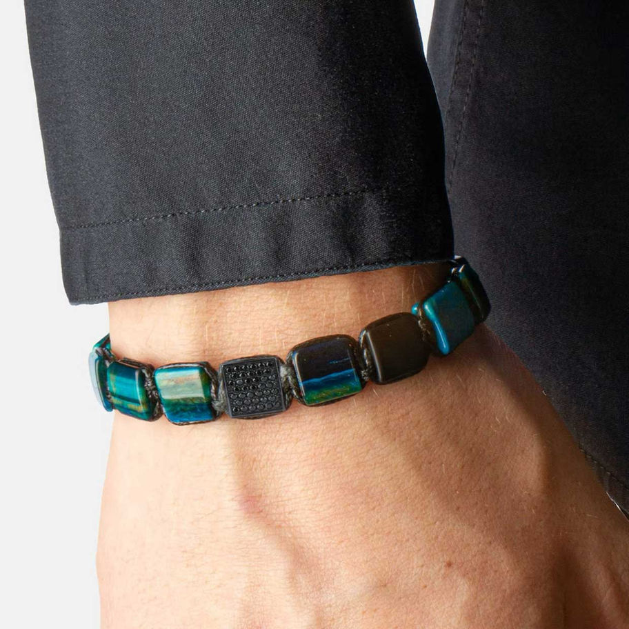 Blue Tiger Eye braided Gemstone Bracelet 10mm bracelet is a unique combination of blue tiger’s eye stones and black matte onyx, which harmoniously pair with a black cord. The natural reflections of the stones add depth and catch the eye, while the overall look remains modern and refined. The design is completed with 925 sterling silver details coated with ruthenium and a decorative black cubic zirconia, which emphasizes the bracelet’s sophisticated character and adds a subtle sparkle.